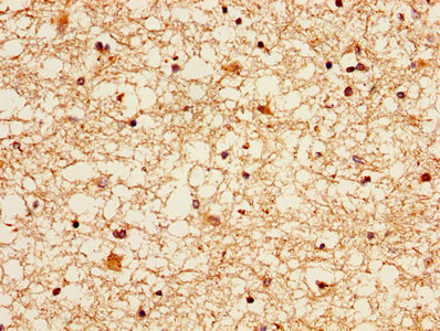 IHC image of CSB-PA02159A0Rb diluted at 1:300 and staining in paraffin-embedded human brain tissue performed on a Leica BondTM system. After dewaxing and hydration, antigen retrieval was mediated by high pressure in a citrate buffer (pH 6.0). Section was blocked with 10% normal goat serum 30min at RT. Then primary antibody (1% BSA) was incubated at 4°C overnight. The primary is detected by a biotinylated secondary antibody and visualized using an HRP conjugated SP system.
