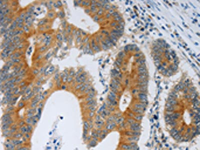 The image on the left is immunohistochemistry of paraffin-embedded Human colon cancer tissue using CSB-PA916397(F2R Antibody) at dilution 1/40, on the right is treated with synthetic peptide. (Original magnification: ×200)