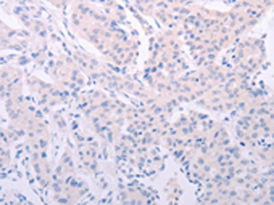 The image on the left is immunohistochemistry of paraffin-embedded Human lung cancer tissue using CSB-PA960978(F7 Antibody) at dilution 1/30, on the right is treated with fusion protein. (Original magnification: ×200)
