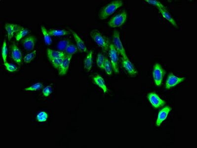 Immunofluorescent analysis of HepG2 cells using CSB-PA822239LA01HU at dilution of 1:100 and Alexa Fluor 488-congugated AffiniPure Goat Anti-Rabbit IgG(H+L)