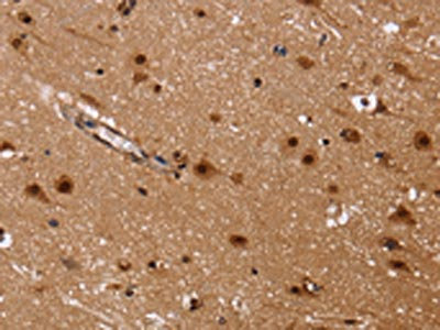The image on the left is immunohistochemistry of paraffin-embedded Human brain tissue using CSB-PA730045(FASTKD5 Antibody) at dilution 1/40, on the right is treated with fusion protein. (Original magnification: ×200)