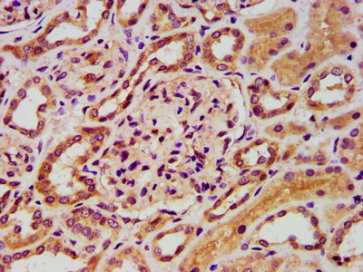 IHC image of CSB-PA759173LA01HU diluted at 1:400 and staining in paraffin-embedded human kidney tissue performed on a Leica BondTM system. After dewaxing and hydration, antigen retrieval was mediated by high pressure in a citrate buffer (pH 6.0). Section was blocked with 10% normal goat serum 30min at RT. Then primary antibody (1% BSA) was incubated at 4°C overnight. The primary is detected by a biotinylated secondary antibody and visualized using an HRP conjugated SP system.
