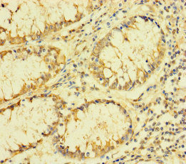 Immunohistochemistry of paraffin-embedded human colon cancer using CSB-PA01825A0Rb at dilution of 1:100