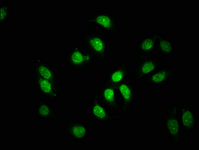 Immunofluorescence staining of A549 cells with CSB-PA008447LA01HU at 1:66, counter-stained with DAPI. The cells were fixed in 4% formaldehyde, permeabilized using 0.2% Triton X-100 and blocked in 10% normal Goat Serum. The cells were then incubated with the antibody overnight at 4°C. The secondary antibody was Alexa Fluor 488-congugated AffiniPure Goat Anti-Rabbit IgG(H+L).