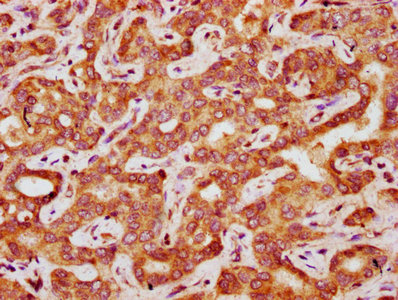 IHC image of CSB-PA008447LA01HU diluted at 1:200 and staining in paraffin-embedded human liver cancer performed on a Leica BondTM system. After dewaxing and hydration, antigen retrieval was mediated by high pressure in a citrate buffer (pH 6.0). Section was blocked with 10% normal goat serum 30min at RT. Then primary antibody (1% BSA) was incubated at 4°C overnight. The primary is detected by a biotinylated secondary antibody and visualized using an HRP conjugated SP system.