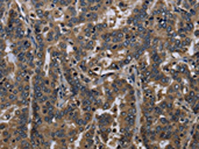 The image on the left is immunohistochemistry of paraffin-embedded Human liver cancer tissue using CSB-PA288891(FGF18 Antibody) at dilution 1/40, on the right is treated with fusion protein. (Original magnification: ×200)