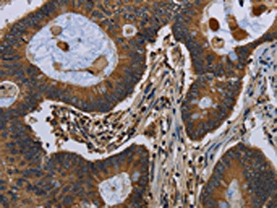 The image on the left is immunohistochemistry of paraffin-embedded Human colon cancer tissue using CSB-PA288891(FGF18 Antibody) at dilution 1/40, on the right is treated with fusion protein. (Original magnification: ×200)