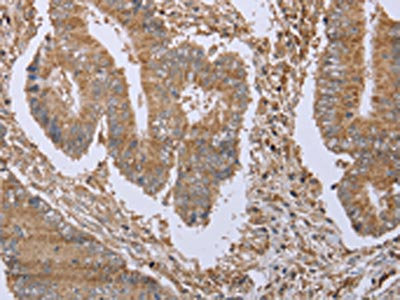 The image on the left is immunohistochemistry of paraffin-embedded Human colon cancer tissue using CSB-PA295162(FHL1 Antibody) at dilution 1/20, on the right is treated with fusion protein. (Original magnification: ×200)