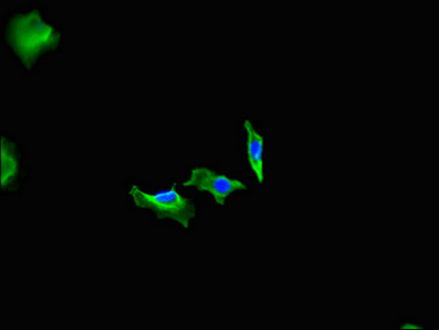 Immunofluorescent analysis of Hela cells using CSB-PA008676LA01HU at dilution of 1:100 and Alexa Fluor 488-congugated AffiniPure Goat Anti-Rabbit IgG(H+L)