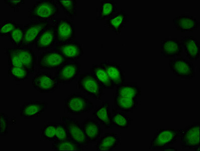 Immunofluorescent analysis of A549 cells using CSB-PA008714LA01HU at dilution of 1:100 and Alexa Fluor 488-congugated AffiniPure Goat Anti-Rabbit IgG(H+L)
