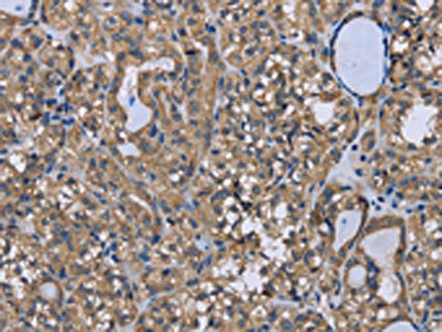 The image on the left is immunohistochemistry of paraffin-embedded Human thyroid cancer tissue using CSB-PA177666(FOXO1 Antibody) at dilution 1/20, on the right is treated with synthetic peptide. (Original magnification: ×200)