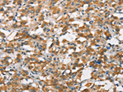 The image on the left is immunohistochemistry of paraffin-embedded Human gastric cancer tissue using CSB-PA991727(FZD1 Antibody) at dilution 1/15, on the right is treated with synthetic peptide. (Original magnification: ×200)