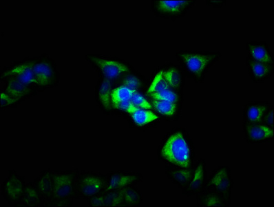 Immunofluorescence staining of Hela cells with CSB-PA009152LA01HU at 1:100, counter-stained with DAPI. The cells were fixed in 4% formaldehyde, permeabilized using 0.2% Triton X-100 and blocked in 10% normal Goat Serum. The cells were then incubated with the antibody overnight at 4°C. The secondary antibody was Alexa Fluor 488-congugated AffiniPure Goat Anti-Rabbit IgG(H+L).