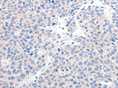 The image on the left is immunohistochemistry of paraffin-embedded Human liver cancer tissue using CSB-PA594444(GCK Antibody) at dilution 1/20, on the right is treated with synthetic peptide. (Original magnification: ×200)