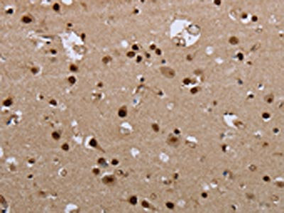 The image on the left is immunohistochemistry of paraffin-embedded Human brain tissue using CSB-PA295309(GCKR Antibody) at dilution 1/50, on the right is treated with fusion protein. (Original magnification: ×200)