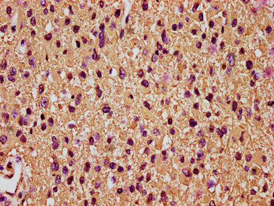 IHC image of CSB-PA009369LA01HU diluted at 1:200 and staining in paraffin-embedded human glioma performed on a Leica BondTM system. After dewaxing and hydration, antigen retrieval was mediated by high pressure in a citrate buffer (pH 6.0). Section was blocked with 10% normal goat serum 30min at RT. Then primary antibody (1% BSA) was incubated at 4°C overnight. The primary is detected by a biotinylated secondary antibody and visualized using an HRP conjugated SP system.