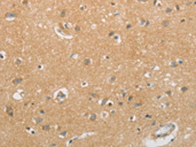 The image on the left is immunohistochemistry of paraffin-embedded Human brain tissue using CSB-PA551964(GJB6 Antibody) at dilution 1/60, on the right is treated with synthetic peptide. (Original magnification: ×200)