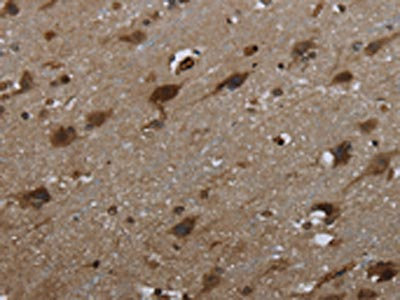 The image on the left is immunohistochemistry of paraffin-embedded Human brain tissue using CSB-PA962337(GLIPR1 Antibody) at dilution 1/50, on the right is treated with fusion protein. (Original magnification: ×200)