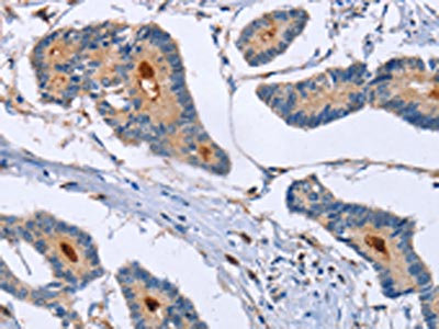 The image on the left is immunohistochemistry of paraffin-embedded Human colon cancer tissue using CSB-PA552403(GMFG Antibody) at dilution 1/50, on the right is treated with fusion protein. (Original magnification: ×200)