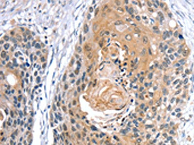 The image on the left is immunohistochemistry of paraffin-embedded Human esophagus cancer tissue using CSB-PA693151(GNAT3 Antibody) at dilution 1/35, on the right is treated with synthetic peptide. (Original magnification: ×200)