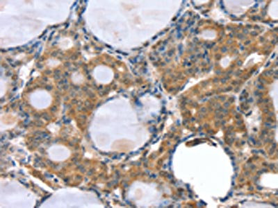 The image on the left is immunohistochemistry of paraffin-embedded Human thyroid cancer tissue using CSB-PA693151(GNAT3 Antibody) at dilution 1/35, on the right is treated with synthetic peptide. (Original magnification: ×200)