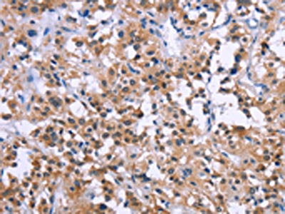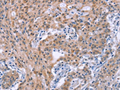 The image on the left is immunohistochemistry of paraffin-embedded Human gastric cancer tissue using CSB-PA226932(GNPAT Antibody) at dilution 1/30, on the right is treated with synthetic peptide. (Original magnification: ×200)