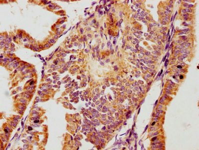 IHC image of CSB-PA009721LA01HU diluted at 1:100 and staining in paraffin-embedded human endometrial cancer performed on a Leica BondTM system. After dewaxing and hydration, antigen retrieval was mediated by high pressure in a citrate buffer (pH 6.0). Section was blocked with 10% normal goat serum 30min at RT. Then primary antibody (1% BSA) was incubated at 4°C overnight. The primary is detected by a biotinylated secondary antibody and visualized using an HRP conjugated SP system.