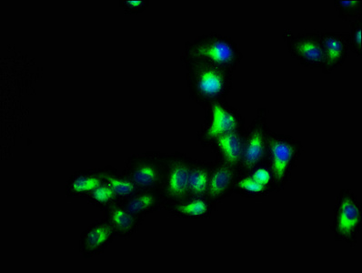 Immunofluorescence staining of Hela cells with CSB-PA009742LA01HU at 1:66, counter-stained with DAPI. The cells were fixed in 4% formaldehyde, permeabilized using 0.2% Triton X-100 and blocked in 10% normal Goat Serum. The cells were then incubated with the antibody overnight at 4°C. The secondary antibody was Alexa Fluor 488-congugated AffiniPure Goat Anti-Rabbit IgG(H+L).