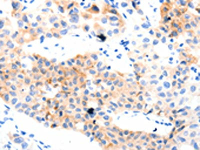 The image on the left is immunohistochemistry of paraffin-embedded Human lung cancer tissue using CSB-PA241224(GPR3 Antibody) at dilution 1/55, on the right is treated with synthetic peptide. (Original magnification: ×200)