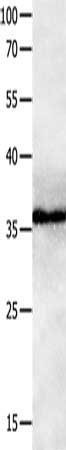 Gel: 10%SDS-PAGE, Lysate: 40 μg, Lane: Human brain malignant glioma tissue, Primary antibody: CSB-PA241224(GPR3 Antibody) at dilution 1/1100, Secondary antibody: Goat anti rabbit IgG at 1/8000 dilution, Exposure time: 2 minutes