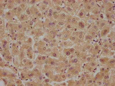 IHC image of CSB-PA009810OA01HU diluted at 1:100 and staining in paraffin-embedded human liver tissue performed on a Leica BondTM system. After dewaxing and hydration, antigen retrieval was mediated by high pressure in a citrate buffer (pH 6.0). Section was blocked with 10% normal goat serum 30min at RT. Then primary antibody (1% BSA) was incubated at 4°C overnight. The primary is detected by a biotinylated secondary antibody and visualized using an HRP conjugated SP system.