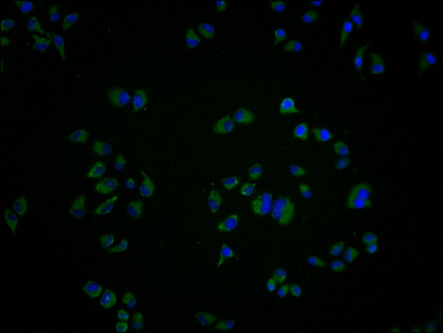 Immunofluorescence staining of Hela cells with CSB-PA009929LA11HU at 1:100, counter-stained with DAPI. The cells were fixed in 4% formaldehyde and blocked in 10% normal Goat Serum. The cells were then incubated with the antibody overnight at 4°C. The secondary antibody was Alexa Fluor 488-congugated AffiniPure Goat Anti-Rabbit IgG(H+L).