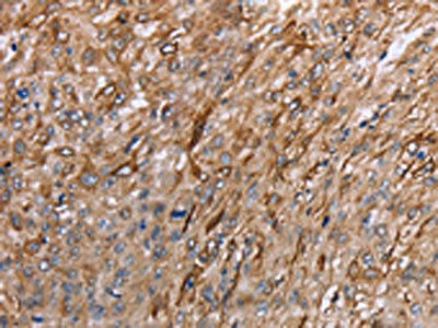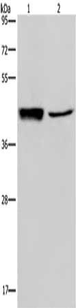 Gel: 8%SDS-PAGE, Lysate: 40 μg, Lane 1-2: Human hepatocellular carcinoma tissue, A549 cells, Primary antibody: CSB-PA156499(GRPR Antibody) at dilution 1/300, Secondary antibody: Goat anti rabbit IgG at 1/8000 dilution, Exposure time: 5 minutes