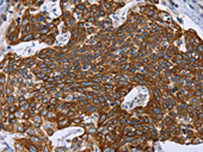 The image on the left is immunohistochemistry of paraffin-embedded Human esophagus cancer tissue using CSB-PA156499(GRPR Antibody) at dilution 1/40, on the right is treated with synthetic peptide. (Original magnification: ×200)