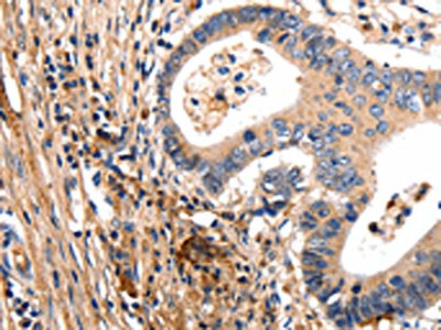 The image on the left is immunohistochemistry of paraffin-embedded Human colon cancer tissue using CSB-PA932427(GSK3A Antibody) at dilution 1/50, on the right is treated with synthetic peptide. (Original magnification: ×200)