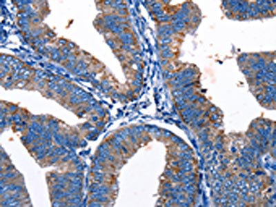 The image on the left is immunohistochemistry of paraffin-embedded Human colon cancer tissue using CSB-PA448173(Gjc3 Antibody) at dilution 1/10, on the right is treated with synthetic peptide. (Original magnification: ×200)