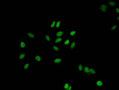 Immunofluorescent analysis of Hela cells using CSB-PA010087PA107nme1HU at dilution of 1:100 and Alexa Fluor 488-congugated AffiniPure Goat Anti-Rabbit IgG(H+L)