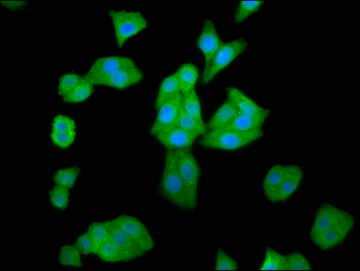 Immunofluorescence staining of HepG2 cells with CSB-PA010123LA01HU at 1:66, counter-stained with DAPI. The cells were fixed in 4% formaldehyde, permeabilized using 0.2% Triton X-100 and blocked in 10% normal Goat Serum. The cells were then incubated with the antibody overnight at 4°C. The secondary antibody was Alexa Fluor 488-congugated AffiniPure Goat Anti-Rabbit IgG(H+L).