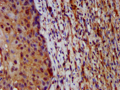 IHC image of CSB-PA010123LA01HU diluted at 1:200 and staining in paraffin-embedded human lung cancer performed on a Leica BondTM system. After dewaxing and hydration, antigen retrieval was mediated by high pressure in a citrate buffer (pH 6.0). Section was blocked with 10% normal goat serum 30min at RT. Then primary antibody (1% BSA) was incubated at 4°C overnight. The primary is detected by a biotinylated secondary antibody and visualized using an HRP conjugated SP system.