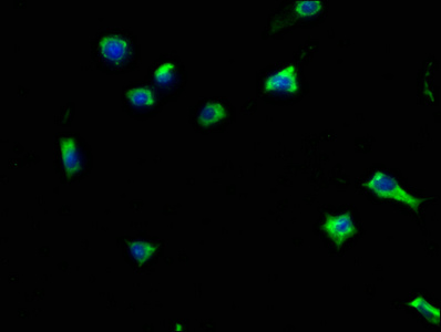 Immunofluorescence staining of SH-SY5Y cells with CSB-PA010231HA01HU at 1:133, counter-stained with DAPI. The cells were fixed in 4% formaldehyde, permeabilized using 0.2% Triton X-100 and blocked in 10% normal Goat Serum. The cells were then incubated with the antibody overnight at 4°C. The secondary antibody was Alexa Fluor 488-congugated AffiniPure Goat Anti-Rabbit IgG(H+L).