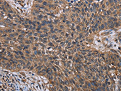 The image on the left is immunohistochemistry of paraffin-embedded Human lung cancer tissue using CSB-PA968396(HIF1A Antibody) at dilution 1/40, on the right is treated with fusion protein. (Original magnification: ×200)