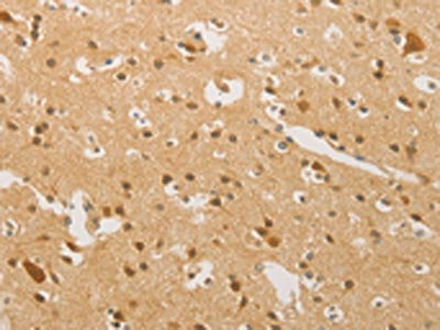 The image on the left is immunohistochemistry of paraffin-embedded Human brain tissue using CSB-PA072130(HIPK4 Antibody) at dilution 1/30, on the right is treated with fusion protein. (Original magnification: ×200)