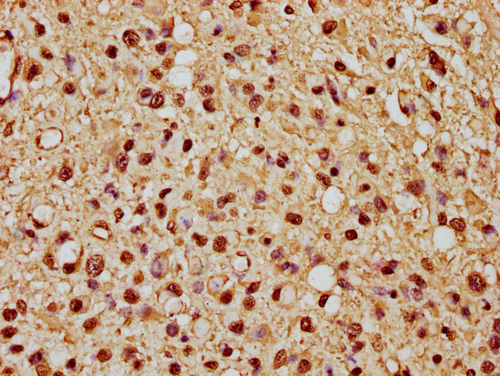 IHC image of CSB-PA010376OA21nme1HU diluted at 1:10 and staining in paraffin-embedded human glioma cancer performed on a Leica BondTM system. After dewaxing and hydration, antigen retrieval was mediated by high pressure in a citrate buffer (pH 6.0). Section was blocked with 10% normal goat serum 30min at RT. Then primary antibody (1% BSA) was incubated at 4°C overnight. The primary is detected by a biotinylated secondary antibody and visualized using an HRP conjugated SP system.