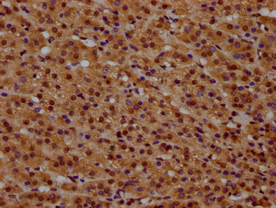 IHC image of CSB-PA010379OA34nbhbHU diluted at 1:20 and staining in paraffin-embedded human adrenal gland tissue performed on a Leica BondTM system. After dewaxing and hydration, antigen retrieval was mediated by high pressure in a citrate buffer (pH 6.0). Section was blocked with 10% normal goat serum 30min at RT. Then primary antibody (1% BSA) was incubated at 4°C overnight. The primary is detected by a biotinylated secondary antibody and visualized using an HRP conjugated SP system.