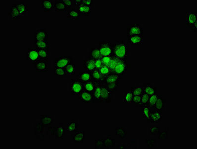 Immunofluorescence staining of PC-3 cells with CSB-PA010379OA34nbhbHU at 1:1.5, counter-stained with DAPI. The cells were fixed in 4% formaldehyde, permeabilized using 0.2% Triton X-100 and blocked in 10% normal Goat Serum. The cells were then incubated with the antibody overnight at 4°C. The secondary antibody was Alexa Fluor 488-congugated AffiniPure Goat Anti-Rabbit IgG(H+L).