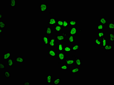 Immunofluorescence staining of Hela cells with CSB-PA010389OA05nbutHU at 1:1.5, counter-stained with DAPI. The cells were fixed in 4% formaldehyde, permeabilized using 0.2% Triton X-100 and blocked in 10% normal Goat Serum. The cells were then incubated with the antibody overnight at 4°C. The secondary antibody was Alexa Fluor 488-congugated AffiniPure Goat Anti-Rabbit IgG(H+L).