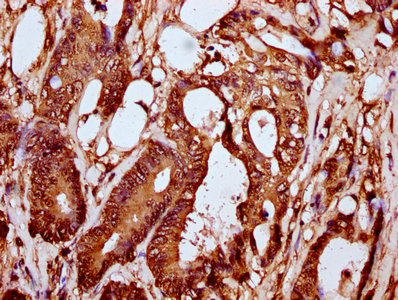 IHC image of CSB-PA010403OA108nforHU diluted at 1:10 and staining in paraffin-embedded human colon cancer performed on a Leica BondTM system. After dewaxing and hydration, antigen retrieval was mediated by high pressure in a citrate buffer (pH 6.0). Section was blocked with 10% normal goat serum 30min at RT. Then primary antibody (1% BSA) was incubated at 4°C overnight. The primary is detected by a biotinylated secondary antibody and visualized using an HRP conjugated SP system.