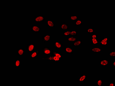 Immunofluorescent analysis of Hela cells using CSB-PA010418OA23nacHU at dilution of 1:100 and Cy3-congugated Goat Anti-Rabbit IgG