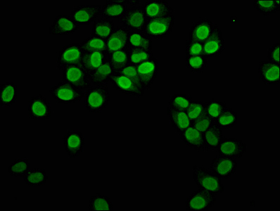 Immunofluorescence staining of Hela cells with CSB-PA010418OA23nforHU at 1:20, counter-stained with DAPI. The cells were fixed in 4% formaldehyde, permeabilized using 0.2% Triton X-100 and blocked in 10% normal Goat Serum. The cells were then incubated with the antibody overnight at 4°C. The secondary antibody was Alexa Fluor 488-congugated AffiniPure Goat Anti-Rabbit IgG(H+L).