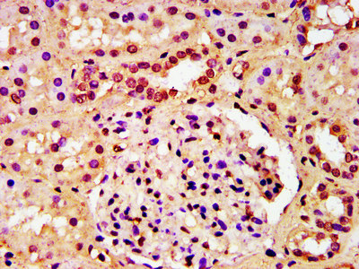 IHC image of CSB-PA010418OA23nforHU diluted at 1:40 and staining in paraffin-embedded human kidney tissue performed on a Leica BondTM system. After dewaxing and hydration, antigen retrieval was mediated by high pressure in a citrate buffer (pH 6.0). Section was blocked with 10% normal goat serum 30min at RT. Then primary antibody (1% BSA) was incubated at 4°C overnight. The primary is detected by a biotinylated secondary antibody and visualized using an HRP conjugated SP system.